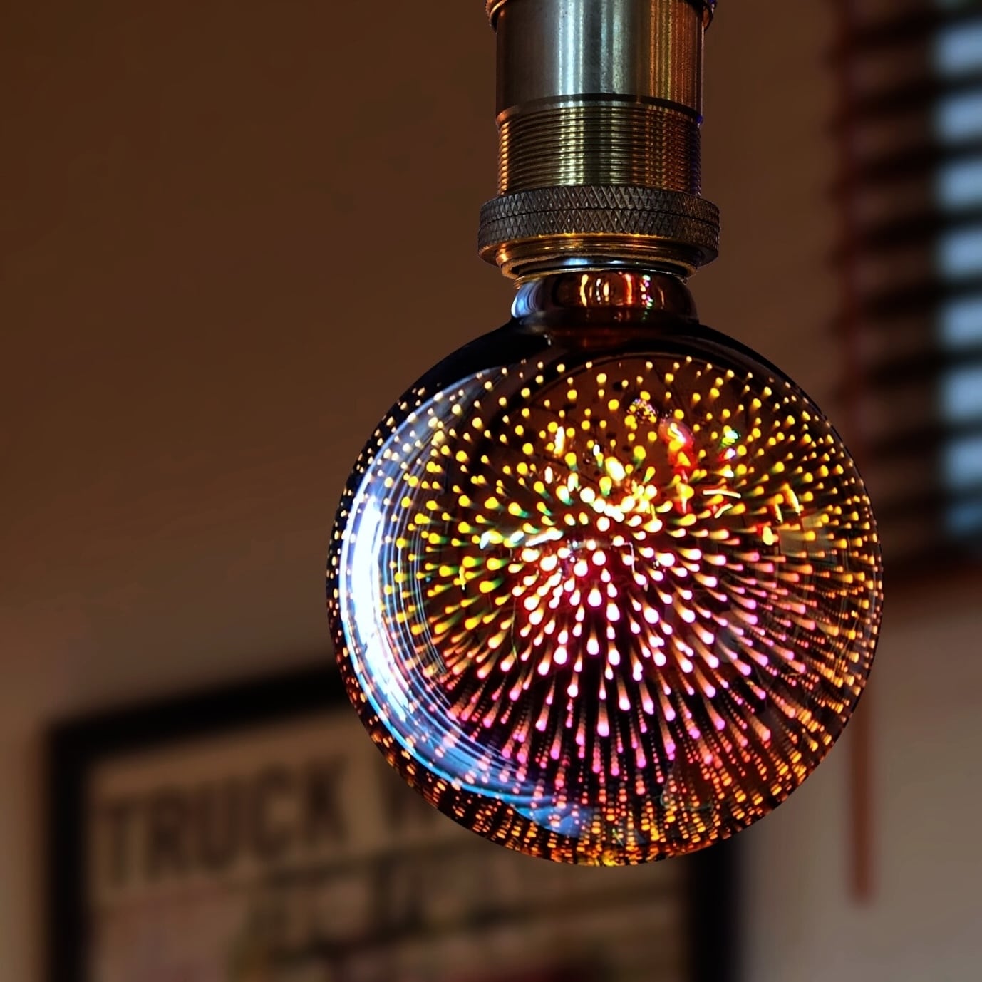 直径95mmのガラスグローブには3D加工が施されており、点灯すると虹色の光が球体全体に広がり、まるで夜空に咲く一瞬の花火や星雲を切り取ったかのような輝きを放ちます。消灯時はミラー仕様のクールな外観で、点灯していない時でもモダンで洗練されたインテリア性を備えています。