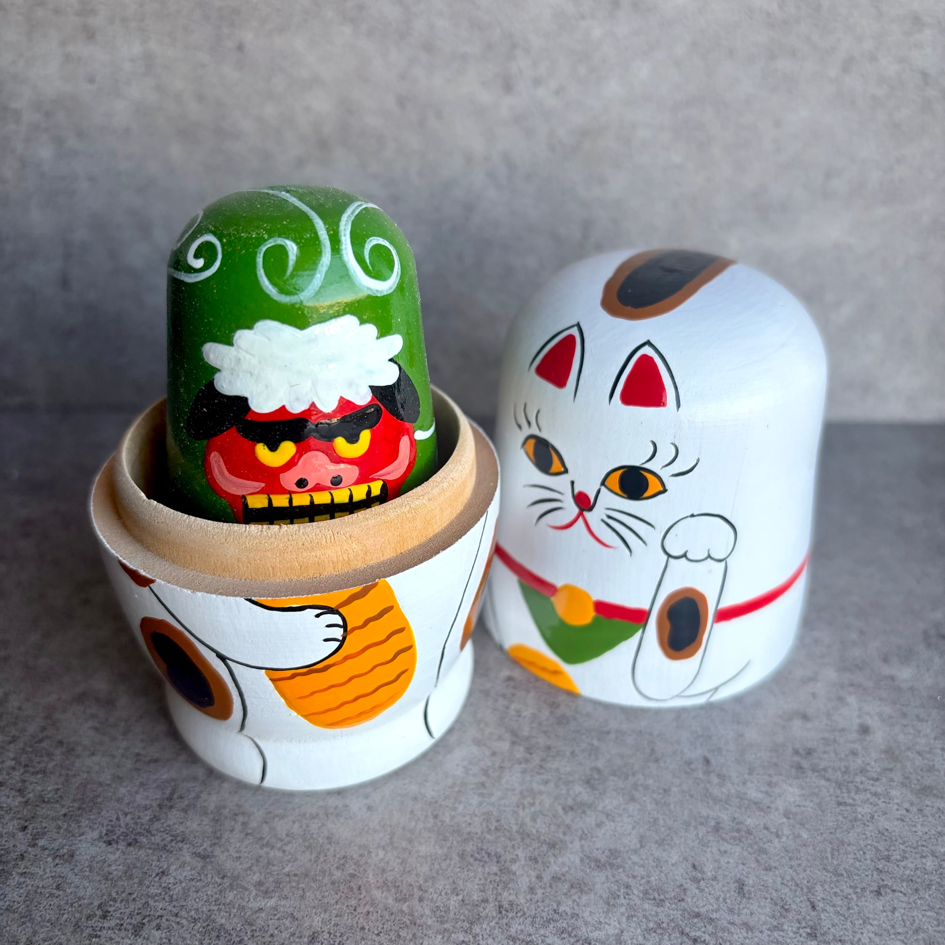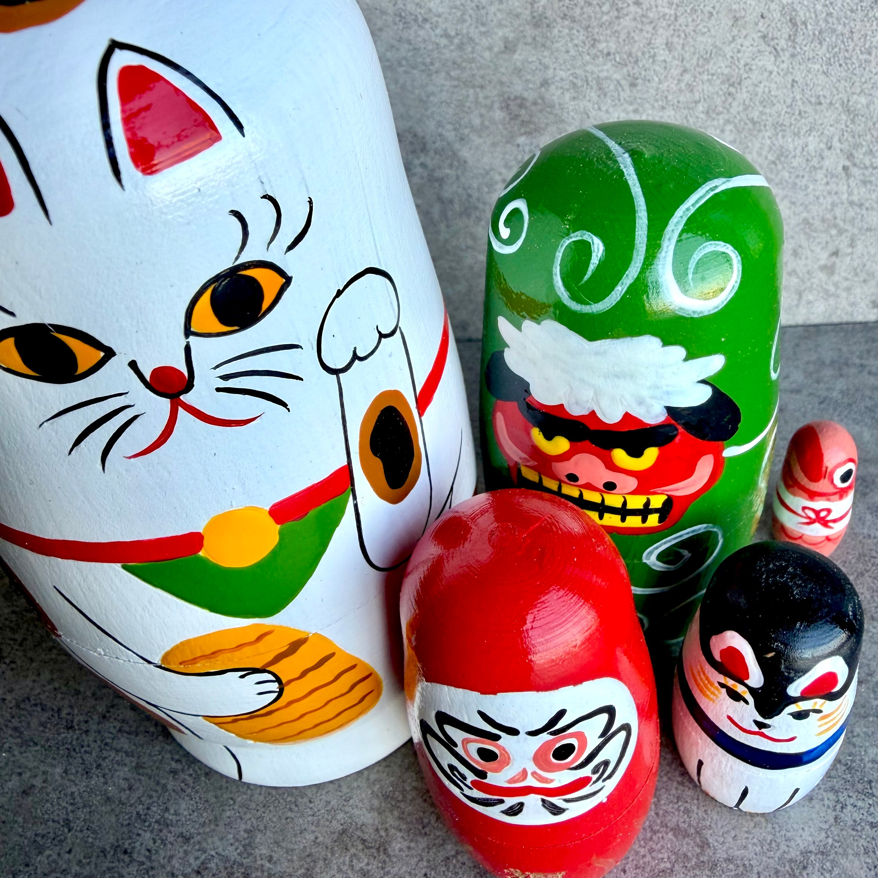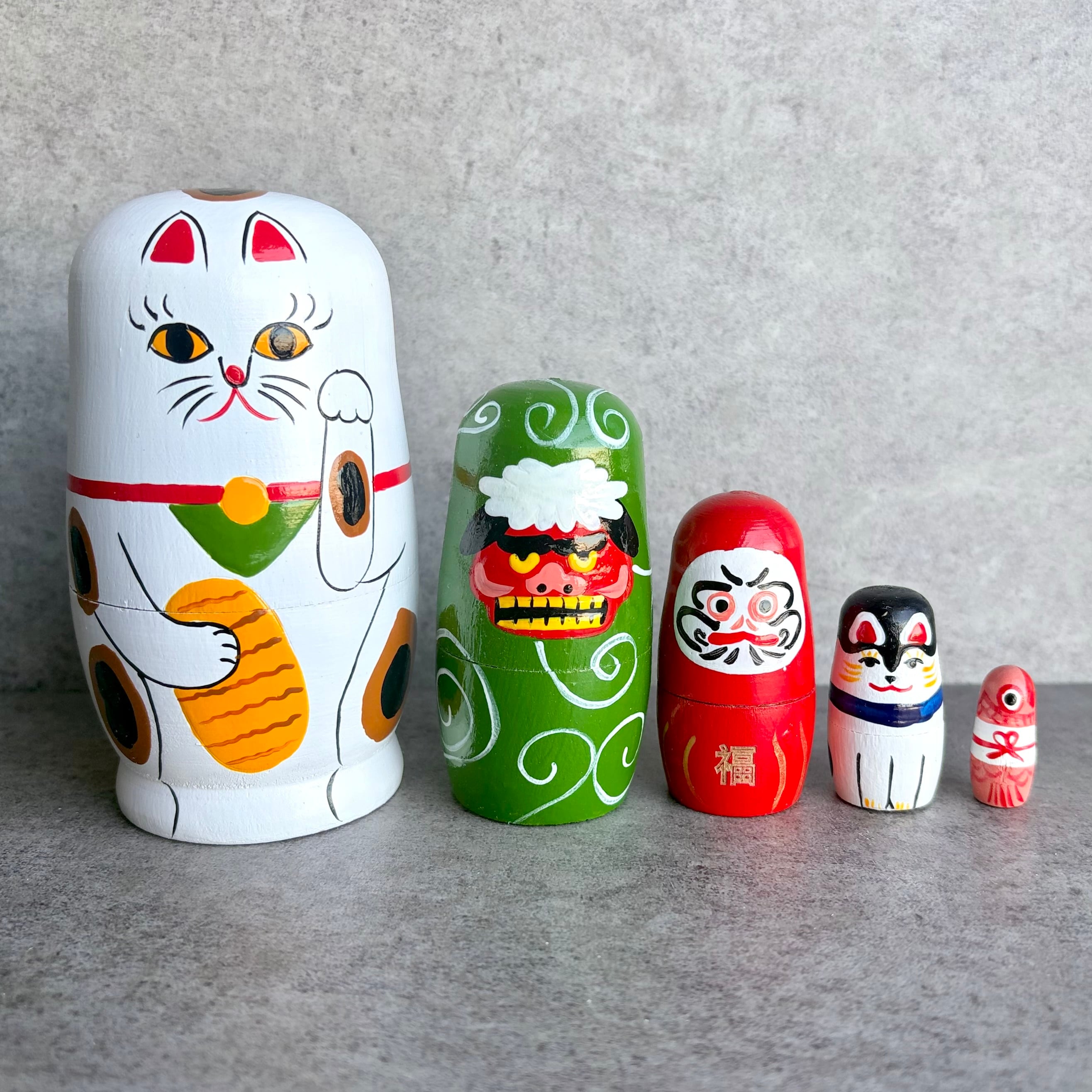 一般的な民族衣装姿のマトリョーシカとは異なり、招き猫・獅子舞・だるま・犬張子・鯛といった縁起の良いモチーフをかたどり、ひとつひとつ個性豊かな表情に仕上げられています。かわいらしさの中にどこか不思議で味わい深い雰囲気があり、見る人の心を惹きつけます。