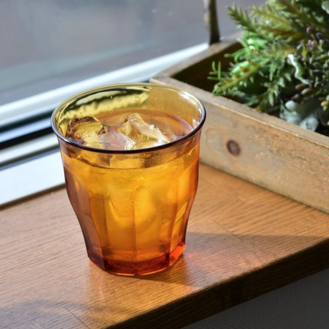 デザイン面では、「ピカルディー」特有の縦リブが施されたフォルムが魅力で、手にフィットしやすく、持ちやすさも兼ね備えています。カラーは温かみのある「アンバー(琥珀色)」で、食卓に落ち着いた雰囲気とレトロな味わいを加えます。この色はガラスそのものに練り込まれているため、色落ちや剥がれの心配もありません。