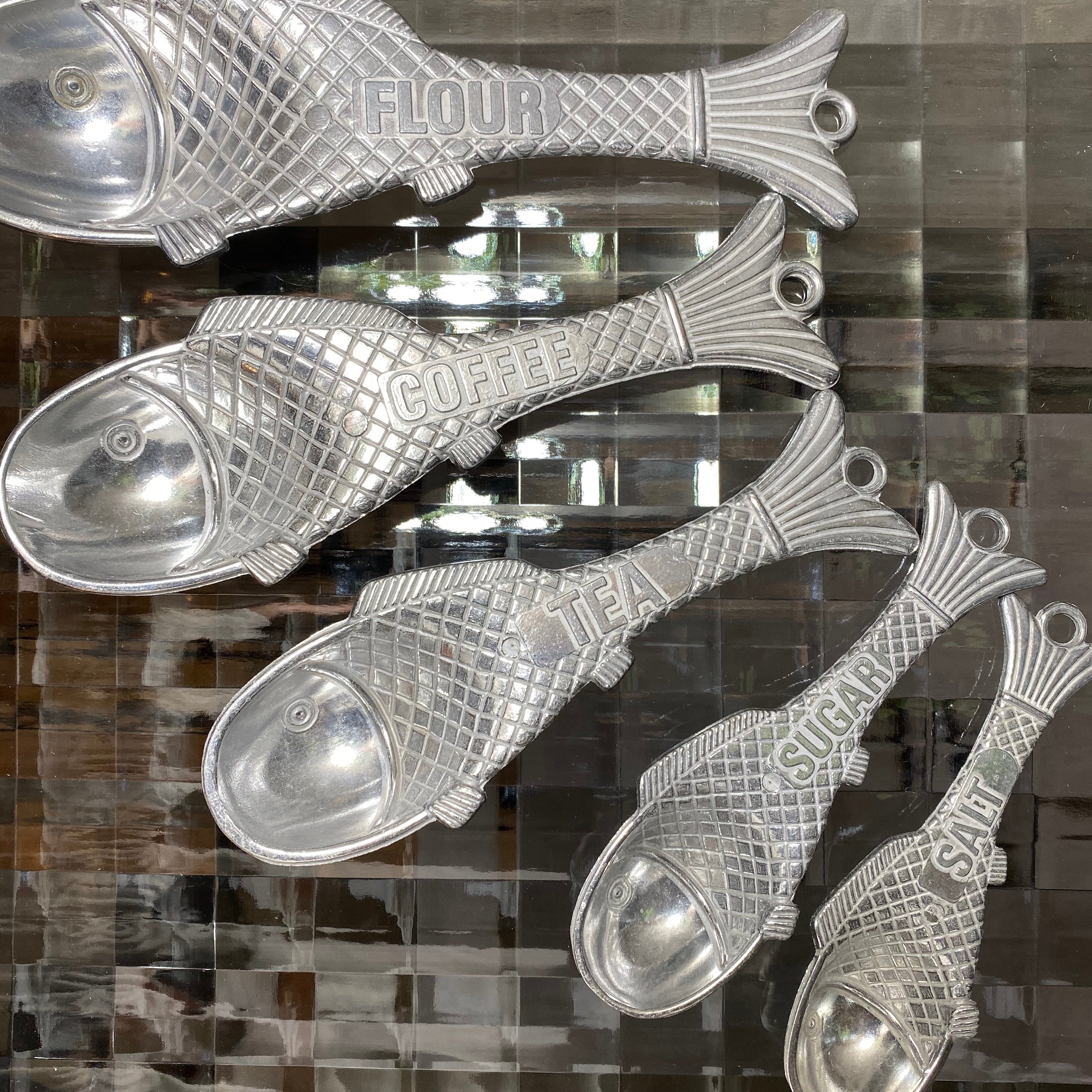 魚のフォルムをした、5本セットのアルミ製計量スプーン。