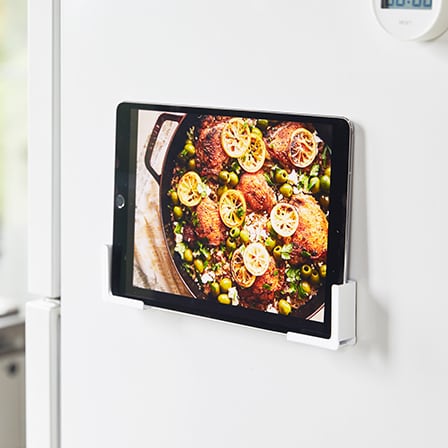 L字型の強力マグネット付きホルダーで端末を挟み込んで固定できるので、冷蔵庫の側面やお風呂の壁などのマグネットが付く場所ならどこでも使えます。